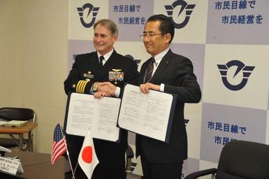 | Keywords: US Navy 101117-N-8730P-146 Capt. Eric Gardner, left, commanding officer of Naval Air Facility Atsugi, and Fujisawa City Mayor Yasunori Ebine shake.jpg en FUJISAWA Japan Nov 17 2010 Capt Eric Gardner left commanding officer of Naval Air Facility Atsugi and Fujisawa City Mayor Yasunori Ebine shake hands after signing a memorandum of understanding at Fujisawa City Hall The memorandum outlines what Naval Air Facility Atsugi can do for Fujisawa City during and after major crises such as a typhoon or earthquake The three-year goal for the naval air facility is to have a signed memorandum of understanding with all of the cities surrounding the installation U S Navy photo by Mass Communication Specialist 1st Class Charles Panter/Released 2010-11-17 101117-N-8730P-146 Navy http //www navy mil/view_image asp id 94264 U S Navy photo by Mass Communication Specialist 1st Class Charles Panter PD-USGov-Military-Navy Images from US Navy location FUJISAWA Japan Mayors of Japan |