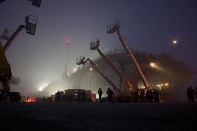 | Keywords: US Navy 101118-N-9643K-785 Sailors assigned to the amphibious assault ship USS Bonhomme Richard (LHD 6) walk through early morning fog to the ship.jpg en SAN DIEGO Nov 18 2010 Sailors assigned to the amphibious assault ship USS Bonhomme Richard LHD 6 walk through early morning fog to the ship and the messing and berthing barge Bonhomme Richard is preparing for a dry-dock maintenance availability period starting in December U S Navy photo by Chief Mass Communication Specialist Joe Kane/Released 2010-11-18 101118-N-9643K-785 Navy http //www navy mil/view_image asp id 94329 U S Navy photo by Chief Mass Communication Specialist Joe Kane PD-USGov-Military-Navy General views of USS Bonhomme Richard LHD-6 Cherry pickers in the United States Photographs by Joseph Kane |