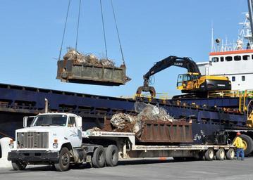 | Keywords: US Navy 101122-N-8241M-014 The cargo ship MV Sydney Marie takes on scrap metal at Naval Station Guantanamo Bay, Cuba.jpg en GUANTANAMO BAY Cuba Nov 22 2010 The cargo ship MV Sydney Marie takes on scrap metal at Naval Station Guantanamo Bay Cuba Approximately 18 thousand cubic tons of scrap metal was loaded onto the Sydney Marie The scrap metal was gathered as part of the naval station's recycling program U S Navy photo by Chief Mass Communication Specialist Bill Mesta/Released 2010-11-22 101122-N-8241M-014 Navy http //www navy mil/view_image asp id 94523 U S Navy photo by Chief Mass Communication Specialist Bill Mesta PD-USGov-Military-Navy Flatbed step frame semi-trailer trucks Vehicle transport at the Guantanamo Bay Naval Base Truck Volvo EC360CL |