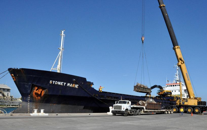 Keywords: US Navy 101122-N-8241M-011 The cargo ship MV Sydney Marie takes on scrap metal at Naval Station Guantanamo Bay, Cuba.jpg en GUANTANAMO BAY Cuba Nov 22 2010 The cargo ship MV Sydney Marie takes on scrap metal at Naval Station Guantanamo Bay Cuba Approximately 18 thousand cubic tons of scrap metal was loaded onto the Sydney Marie The scrap metal was gathered as part of the naval station's recycling program U S Navy photo by Chief Mass Communication Specialist Bill Mesta/Released 2010-11-22 101122-N-8241M-011 Navy http //www navy mil/view_image asp id 94522 U S Navy photo by Chief Mass Communication Specialist Bill Mesta PD-USGov-Military-Navy Telescope cranes US Navy vessels at the Guantanamo Bay Naval Base ¢ Vehicle transport at the Guantanamo Bay Naval Base |