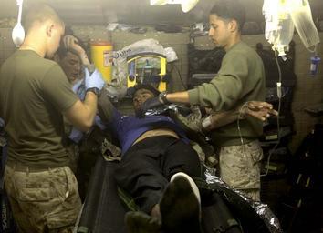 | Keywords: US Navy 101206-M-7825S-062 Hospital Corpsmen render medical assistance to an Afghan National Army soldier at Forward Operating Base Jackson.jpg en SANGIN Afghanistan Dec 6 2010 Hospital Corpsmen assigned to 3rd Battalion 5th Marine Regiment and 1st Marine Logistics Group render medical assistance to an Afghan National Army soldier at Forward Operating Base Jackson The battalion is one of the combat elements of Regimental Combat Team 2 conducting counterinsurgency operations in partnership with the International Security Assistance Force U S Marine Corps photo by Sgt Artur Shvartsberg/Released 2010-12-06 101206-M-7825S-062 Navy http //www navy mil/view_image asp id 95467 U S Marine Corps photo by Sgt Artur Shvartsberg PD-USGov-Military-Navy Forward Operating Base Jackson Wounded soldiers Intravenous therapy |