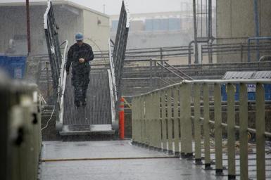 | Keywords: US Navy 101221-N-9643K-383 A Sailor assigned to the amphibious assault ship USS Bonhomme Richard (LHD 6) walks the causeway between the ship and th.jpg en SAN DIEGO Dec 21 2010 A Sailor assigned to the amphibious assault ship USS Bonhomme Richard LHD 6 walks the causeway between the ship and the messing and berthing barge during a rainstorm Areas of California are under a state of emergency because of severe rains and flooding Bonhomme Richard is in dry dock for maintenance and upgrades U S Navy photo by Chief Mass Communication Specialist Joe Kane/Released 2010-12-21 101221-N-9643K-383 Navy http //www navy mil/view_image asp id 95687 U S Navy photo by Chief Mass Communication Specialist Joe Kane PD-USGov-Military-Navy Aboard USS Bonhomme Richard LHD-6 Photographs by Joseph Kane |