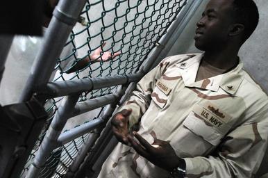 Keywords: US Navy 110210-N-4936C-147 Shipâ^euro,^trade,s Serviceman 3rd Class Darold Johnsonbrown, a Joint Detention Group barber, speaks to a detainee about.jpg en GUANTANAMO BAY Cuba Feb 10 2011 Shipâ s Serviceman 3rd Class Darold Johnsonbrown a Joint Detention Group barber speaks to a detainee about trimming his beard in Camp VI Johnsonbrown is attached to the Navy Expeditionary Guard Battalion which provides a portion of the guard force inside the detention facilities U S Navy photo by Mass Communication Specialist 1st Class David P Coleman/Released 2011-02-10 110210-N-4936C-147 Navy http //www navy mil/view_image asp id 97572 U S Navy photo by Mass Communication Specialist 1st Class David P Coleman PD-USGov-Military-Navy Camp 6 Guantanamo 2010 at the Guantanamo Bay Naval Base Taken with NIKON D300S