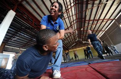 | Keywords: US Navy 110309-N-EC642-149 Maria Martinez, a Honduran port security guard, takes down Senior Chief Master-at-Arms Charles E. Mobley, assigned to a.jpg en SAN LORENZO Honduras March 9 2011 Maria Martinez a Honduran port security guard takes down Senior Chief Master-at-Arms Charles E Mobley assigned to a security training team aboard High Speed Vessel Swift HSV 2 while demonstrating proper takedown techniques during a weeklong Southern Partnership Station 2011 subject matter expert exchange Southern Partnership Station is an annual deployment of U S ships to the U S Southern Command area of responsibility in the Caribbean and Latin America U S Navy photo by Mass Communication Specialist 2nd Class Ricardo J Reyes/Released 2011-03-09 110309-N-EC642-149 Navy http //www navy mil/view_image asp id 98246 U S Navy photo by Mass Communication Specialist 2nd Class Ricardo J Reyes PD-USGov-Military-Navy Images from US Navy location San Lorenzo Honduras 2011 in Honduras |