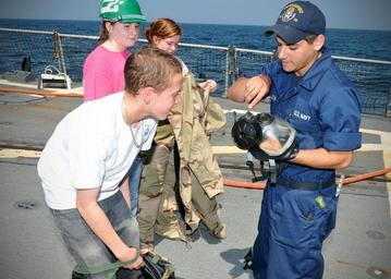| Keywords: US Navy 110324-N-AW702-006 Damage Controlman Fireman Joe Hellow explains the importance of Mission Oriented Protective Posture (MOPP) gear to Rafea.jpg en ATLANTIC OCEAN March 24 2011 Damage Controlman Fireman Joe Hellow explains the importance of Mission Oriented Protective Posture MOPP gear to Rafeal Fernandez a guest aboard the guided missile destroyer USS Roosevelt DDG 80 Fernandez is participating in the friends and family cruise where guests learn experience life aboard a U S Navy vessel U S Navy photo by Mass Communication Specialist 2nd Class Jacob Sippel/Released 2011-03-24 110324-N-AW702-006 Navy http //www navy mil/view_image asp id 99147 U S Navy photo by Mass Communication Specialist 2nd Class Jacob Sippel PD-USGov-Military-Navy Aboard USS Roosevelt DDG-80 Mission Oriented Protective Posture MCU-2/P Protective Mask |