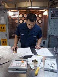| Keywords: US Navy 110330-N-DR144-528 Aviation Structural Mechanic Airman James K. Solomon refers to technical publications before using a hydraulic test stan.jpg en ARABIAN GULF March 30 2011 Aviation Structural Mechanic Airman James K Solomon assigned to the aircraft intermediate maintenance department of the Nimitz-class aircraft carrier USS Carl Vinson CVN 70 refers to technical publications before using a hydraulic test stand to troubleshoot a landing gear control valve in the aviation hydraulic shop Carl Vinson and Carrier Air Wing CVW 17 are conducting maritime security operations and close-air support missions in the U S 5th Fleet area of responsibility U S Navy photo by Mass Communication Specialist 2nd Class James R Evans/Released 2011-03-30 110330-N-DR144-528 Navy http //www navy mil/view_image asp id 99321 U S Navy photo by Mass Communication Specialist 2nd Class James R Evans PD-USGov-Military-Navy Aboard USS Carl Vinson CVN-70 |