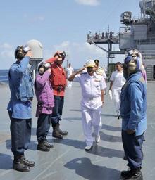 | Keywords: US Navy 110407-N-0864H-506 Rear Adm. Harish Bisht salutes side boys while departing USS Blue Ridge (LCC 19) during a visit in support of exercise M.jpg en PHILIPPINE SEA April 7 2011 Rear Adm Harish Bisht flag officer of Commanding Eastern Fleet salutes side boys while departing the U S 7th Fleet command ship USS Blue Ridge LCC 19 during a visit in support of exercise Malabar 2011 Blue Ridge serves under Commander Expeditionary Strike Group ESG 7/Task Force CTF 76 the Navy's only forward deployed amphibious force U S Navy photo by Mass Communication Specialist 3rd Class Fidel C Hart/Released 2011-04-07 110407-N-0864H-506 Navy http //www navy mil/view_image asp id 99748 U S Navy photo by Mass Communication Specialist 3rd Class Fidel C Hart PD-USGov-Military-Navy Aboard USS Blue Ridge LCC-19 |