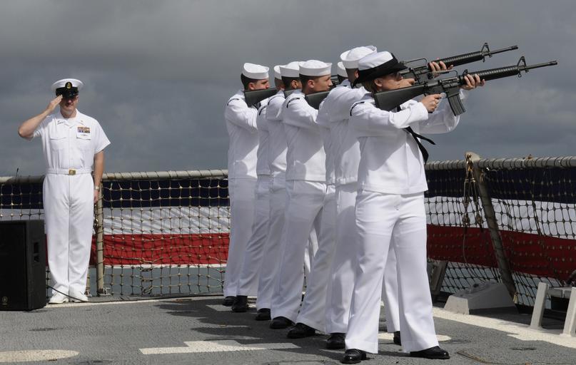 | Keywords: US Navy 110414-N-VM928-098 Upload Photo.jpg en PEARL HARBOR April 14 2011 Sailors from the ceremonial guard assigned to the guided-missile destroyer USS Chung-Hoon DDG 93 perform a 21-gun salute during a remembrance ceremony for the Fletcher-class USS Sigsbee DD 502 on the ship's flight deck The ceremony was held to pay respect to the 23 Sailors whose lives were lost when a kamikaze suicide plane struck Sigsbee on April 14 1945 during the Battle of Okinawa Chung-Hoon is named in honor of Rear Adm Gordon Paie'a Chung-Hoon who was awarded the Navy Cross and Silver Star for gallantry as the commanding officer of Sigsbee during the Battle of Okinawa U S Navy photo by Mass Communication Specialist 2nd Class Robert Stirrup/Released 2011-04-14 110414-N-VM928-098 Navy http //www navy mil/view_image asp id 99923 U S Navy photo by Mass Communication Specialist 2nd Class Robert Stirrup PD-USGov-Military-Navy 2010 in Pearl Harbor Images from US Navy location Pearl Harbor Hawaii Aboard Chung-Hoon DDG-93 USS Sigsbee DD-502 Males with M16 rifle 21 gun salute |