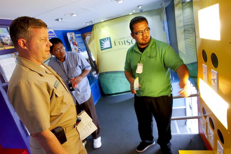 | Keywords: US Navy 110419-N-HW977-301 Cmdr. Jon Jerge views an energy-efficient lighting display inside Southern California Edison's Mobile Energy Unit with E.jpg en NORCO Calif April 19 2011 Cmdr Jon Jerge left officer-in-charge of Naval Weapons Station Seal Beach Detachment Corona views an energy-efficient lighting display inside Southern California Edison's Mobile Energy Unit with Energy Specialist Juan Carballo right during the Earth Day/Arbor Day Celebration at Naval Surface Warfare Center Corona Division The event included a civilian morale welfare and recreation-sponsored lunch as well as booths representing the many clubs and sports leagues on base a mini-car show of fuel-efficient models from local dealers rideshare solar technology displays and a tree-planting ceremony U S Navy photo by Greg Vojtko/Released 2011-04-19 110419-N-HW977-301 Navy http //www navy mil/view_image asp id 100114 U S Navy photo by Greg Vojtko PD-USGov-Military-Navy Images from US Navy location NORCO Calif |
