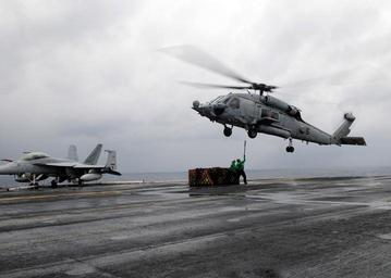 | Keywords: US Navy 110423-N-SG869-047 Logistics Specialist Seaman Immanuel Carter and Logistics Specialist 1st Class Kristopher Forest hook a load onto an SH.jpg en PACIFIC OCEAN April 23 2011 Logistics Specialist Seaman Immanuel Carter from Los Angeles and Logistics Specialist 1st Class Kristopher Forest from Watts Calif hook a load onto an SH-60H Sea Hawk helicopter assigned to the Black Knights of Helicopter Anti-Submarine Squadron HS 4 aboard the aircraft carrier USS Ronald Reagan CVN 76 during a vertical replenishment Ronald Reagan is operating in the Pacific Ocean U S Navy photo by Mass Communication Specialist 2nd Class Josh Cassatt/Released 2011-04-23 110423-N-SG869-047 Navy http //www navy mil/view_image asp id 100232 U S Navy photo by Mass Communication Specialist 2nd Class Josh Cassatt PD-USGov-Military-Navy USS Ronald Reagan CVN-76 underway replenishment Logistics Specialist SH-60F Oceanhawk Helicopter Anti-Submarine Squadron 4 United States Navy Vertical replenishment |