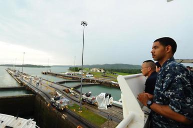| Keywords: US Navy 110426-F-CF975-042 Sailsors watch as a lock fills with water as the Military Sealift Command hospital ship USNS Comfort (T-AH 20).jpg en PANAMA CANAL April 26 2011 Boatswain's Mate 2nd Class Jose Cruzsanchez from Miami and Aviation Machinist's Mate Airman Linh Nguyen from Houston watch as a lock fills with water as the Military Sealift Command hospital ship USNS Comfort T-AH 20 transits through the Panama Canal Comfort is supporting Continuing Promise 2011 a five-month humanitarian assistance mission to the Caribbean Central and South America U S Air Force photo by Senior Airman Kasey Close/Released 2011-04-26 110426-F-CF975-042 Navy http //www navy mil/view_image asp id 100333 U S Air Force photo by Senior Airman Kasey Close PD-USGov-Military-Navy Aboard USNS Comfort T-AH-20 |