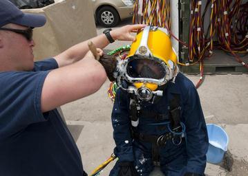 | Keywords: US Navy 110426-N-OT964-167 Navy Diver 1st Class Joel Sharp uses soapy water to check for air leaks on the Kirby Morgan 37 diving helmet of Navy Div.jpg en MINA SALMAN Bahrain April 26 2011 Navy Diver 1st Class Joel Sharp assigned to Mobile Diving and Salvage Unit MDSU 2 uses soapy water to check for air leaks on the Kirby Morgan 37 diving helmet of Navy Diver 2nd Class Cody Creger before conducting a surface-supplied training dive MDSU-2 is assigned to Commander Task Group 56 1 to provide maritime security operations and theater security cooperation efforts in the U S 5th Fleet area of responsibility U S Navy photo by Mass Communication Specialist 3rd Class Martin L Carey/Released 2011-04-26 110426-N-OT964-167 Navy http //www navy mil/view_image asp id 101169 U S Navy photo by Mass Communication Specialist 3rd Class Martin L Carey PD-USGov-Military-Navy Images from US Navy location Mina Salman Bahrain |