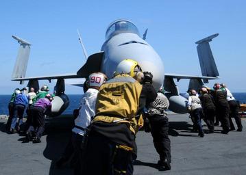 | Keywords: US Navy 110511-N-5574R-389 Sailors maneuver an F-A-18A- Hornet aboard USS George H.W. Bush (CVN 77).jpg en ATLANTIC OCEAN May 11 2011 Sailors maneuver an F/A-18A+ Hornet assigned to the Golden Warriors of Strike Fighter Squadron VFA 87 aboard the aircraft carrier USS George H W Bush CVN 77 George H W Bush the Navy's newest aircraft carrier is deployed as a part of George H W Bush Carrier Strike Group in support of maritime security operations and theater security cooperation efforts in the U S 5th and 6th Fleet areas of responsibility U S Navy photo by Mass Communication Specialist 3rd Class Jeffrey M Richardson/Released 2011-05-11 110511-N-5574R-389 Navy http //www navy mil/view_image asp id 100902 U S Navy photo by Mass Communication Specialist 3rd Class Jeffrey M Richardson PD-USGov-Military-Navy Aboard USS George H W Bush CVN-77 Strike Fighter Squadron 87 United States Navy |