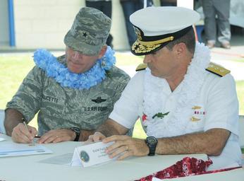 | Keywords: US Navy 110513-N-8185D-010 Brig. Gen. John Doucette and Rear Adm. Paul Bushong sigh a charter with Guam.jpg en TUMON Guam May 13 2011 Brig Gen John Doucette left Commander of the U S Air Force 36th Wing and deputy commander of Joint Region Marianas and Rear Adm Paul Bushong commander of Joint Region Marianas sign the Partnering Charter Agreement to renew the military's traffic safety partnership with the Government of Guam during a signing ceremony at the Guam Department of Public Works Department of Highway Safety office The proclamation signed by Lt Gov Ray Tenorio declared the week of May 15-21 Public Works Week and kicked off the Click it or Ticket Mobilization campaign which will be observed May 23-June 5 U S Navy photo by JoAnna Delfin/Released 2011-05-13 110513-N-8185D-010 Navy http //www navy mil/view_image asp id 101072 U S Navy photo by JoAnna Delfin PD-USGov-Military-Navy Images from US Navy location Tumon Guam Paul Bushong |