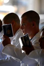 | Keywords: US Navy 110629-N-OA833-005 Plebes in the U.S. Naval Academy Class of 2015 stand at attention and begin memorizing portions of.jpg en ANNAPOLIS Md June 29 2011 Plebes in the U S Naval Academy Class of 2015 stand at attention and begin memorizing portions of Reef Points while reporting to the school's campus on Induction Day Minus One The new 4th class midshipmen will be officially sworn in June 30 the beginning of Plebe Summer six-weeks of training intended to transition the students from civilian to military life U S Navy photo by Mass Communication Specialist 1st Class Chad Runge/Released 2011-06-29 110629-N-OA833-005 Navy http //www navy mil/view_image asp id 103348 U S Navy photo by Mass Communication Specialist 1st Class Chad Runge PD-USGov-Military-Navy United States Naval Academy Induction Day Memorizing |