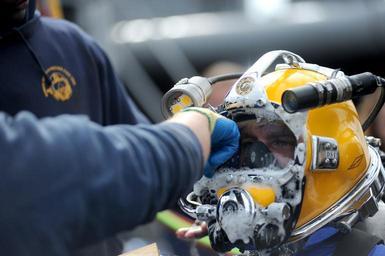 | Keywords: US Navy 110721-N-EF447-062 Chief Navy Diver Bryan Williams, assigned to Mobile Diving and Salvage Unit (MDSU) 2, has soap residue removed from his.jpg en NORTH SEA July 21 2011 Chief Navy Diver Bryan Williams assigned to Mobile Diving and Salvage Unit MDSU 2 has soap residue removed from his KM-37 surface supplied diving helmet before dive operations abaord the Military Sealift Command rescue and salvage ship USNS Grasp T-ARS 51 MDSU-2 and Navy archeologists scientists and historians are in the North Sea conducting diving operations verifying the sites of suspected shipwrecks The researchers hope to find USS Bonhomme Richard the historic ship commanded by John Paul Jones U S Navy photo by Mass Communication Specialist 1st Class Ja'lon A Rhinehart/Released 2011-07-21 110721-N-EF447-062 Navy http //www navy mil/view_image asp id 104628 U S Navy photo by Mass Communication Specialist 1st Class Ja'lon A Rhinehart PD-USGov-Military-Navy Aboard USNS Grasp T-ARS-51 |