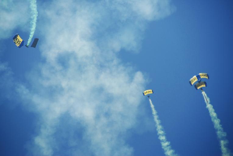 Keywords: US Navy 110728-N-II944-021 The Leap Frogs perform different parachute maneuvers during a training jump above Naval Amphibious Base Coronado.jpg en SAN DIEGO July 28 2011 Members of the U S Navy parachute team the Leap Frogs perform different parachute maneuvers during a training jump above Naval Amphibious Base Coronado The Leap Frogs perform aerial demonstrations across the United States bringing awareness to Naval Special Warfare U S Navy photo by Mass Communication Specialist 2nd Class John Lamb/Released 2011-07-28 110728-N-II944-021 Navy http //www navy mil/view_image asp id 104993 U S Navy photo by Mass Communication Specialist 2nd Class John Lamb PD-USGov-Military-Navy Naval Amphibious Base Coronado United States Navy Parachute Team