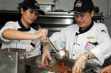 | Keywords: US Navy 110809-N-JV466-008 Thai chefs, Ann Chetcharaporn and Jim Phanita, pour sauce over grilled meat during a cooking lesson for culinary special.jpg en THAILAND Aug 9 2011 Thai chefs Ann Chetcharaporn and Jim Phanita pour sauce over grilled meat during a cooking lesson for culinary specialists aboard the aircraft carrier USS George Washington CVN 73 George Washington is in Thailand for a port visit to strengthen ties with the partner nation U S Navy photo by Chief Mass Communication Specialist John Harrington/Released 2011-08-09 110809-N-JV466-008 Navy http //www navy mil/view_image asp id 105578 U S Navy photo by Chief Mass Communication Specialist John Harrington PD-USGov-Military-Navy Aboard USS George Washington CVN-73 |