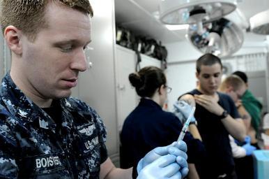| Keywords: US Navy 110923-N-HM829-032 Hospital Corpsman 3rd Class Roland B. Boisvert prepares to administer a flu shot in the medical department aboard the ai.jpg en ARABIAN SEA Sept 23 2011 Hospital Corpsman 3rd Class Roland B Boisvert prepares to administer a flu shot in the medical department aboard the aircraft carrier USS George H W Bush CVN 77 George H W Bush is deployed to the U S 5th Fleet area of responsibility on its first operational deployment conducting maritime security operations and support missions as part of Operations Enduring Freedom and New Dawn U S Navy photo by Mass Communication Specialist Seaman K Cecelia Engrums/Released 2011-09-23 110923-N-HM829-032 Navy http //www navy mil/view_image asp id 107751 U S Navy photo by Mass Communication Specialist Seaman K Cecelia Engrums PD-USGov-Military-Navy Aboard USS George H W Bush CVN-77 |