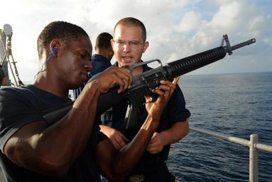 | Keywords: US Navy 111019-N-AX571-119 Sailors participate in a weapons qualification drill on the forecastle aboard the guided-missile cruiser USS Anzio (CG 6.jpg en GULF OF ADEN Oct 19 2011 Logistics Specialist Seaman Christian K Jones left takes basic operation instruction on the M16 rifle from Cryptologic Technician 3rd Class Joshua H Lynch during a weapons qualification drill on the forecastle aboard the guided-missile cruiser USS Anzio CG 68 Anzio is assigned to Combined Task Force 151 a multi-national mission-based task force established by the Combined Maritime Forces in January 2009 to conduct counter-piracy operations in the Red Sea Gulf of Aden Somali Basin and Arabian Sea U S Navy photo by Mass Communication Specialist 1st Class David-Michael Ross/Released 2011-10-19 111019-N-AX571-119 Navy http //www navy mil/view_image asp id 109374 U S Navy photo by Mass Communication Specialist 1st Class David-Michael Ross PD-USGov-Military-Navy USS Anzio CG-68 Males with M16 rifle |