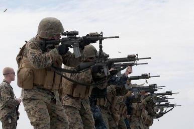 | Keywords: US Navy 111020-N-ER662-307 Marines assigned to the 31st Marine Expeditionary Unit (31st ME) fire their rifles during a live- fire exercise.jpg en SOUTH CHINA SEA Oct 20 2011 Marines assigned to the 31st Marine Expeditionary Unit 31st ME fire their rifles during a live- fire exercise on the flight deck of the forward deployed amphibious transport dock ship USS Denver LPD 9 Denver is part of the Essex Amphibious Ready Group and is conducting operations in the western Pacific region U S Navy photo by Mass Communication Specialist 3rd Class Matthew R Cole/Released 2011-10-20 111020-N-ER662-307 Navy http //www navy mil/view_image asp id 109200 U S Navy photo by Mass Communication Specialist 3rd Class Matthew R Cole PD-USGov-Military-Navy Aboard USS Denver LPD-9 M4 carbine cartridge ejections |