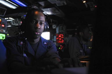 | Keywords: US Navy 111103-N-YM590-024 Operations Specialist 2nd Class Rory Harel stands global command and control system-maritime watch in the Combat Informa.jpg en GULF OF ADEN Nov 3 2011 Operations Specialist 2nd Class Rory Harel stands global command and control system-maritime watch in the Combat Information Center aboard the guided-missile cruiser USS Anzio CG 68 Anzio is assigned to CTF 151 a multi-national mission-based task force established by the Combined Maritime Forces in January 2009 to conduct counter-piracy operations in the Red Sea Gulf of Aden Somali Basin and Arabian Sea U S Navy photo by Mass Communication Specialist 2nd Class Brian M Brooks/Released 2011-11-03 111103-N-YM590-024 Navy http //www navy mil/view_image asp id 110129 U S Navy photo by Mass Communication Specialist 2nd Class Brian M Brooks PD-USGov-Military-Navy USS Anzio CG-68 |