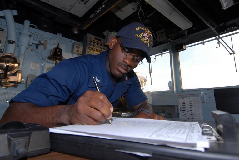 | Keywords: US Navy 111105-N-DU438-039 Quartermaster 3rd Class Brandon Shannon writes an entry into the ship's deck log during a quartermaster watch.jpg en ARABIAN SEA Nov 5 2011 Quartermaster 3rd Class Brandon Shannon writes an entry into the ship's deck log during a quartermaster watch in the ship's pilot house aboard the guided-missile cruiser USS Gettysburg CG 64 Gettysburg is deployed to the U S 5th Fleet area of responsibility conducting maritime security operations and support missions as part of Operations Enduring Freedom and New Dawn U S Navy photo by Mass Communication Specialist 3rd Class Betsy Knapper/Released 2011-11-05 111105-N-DU438-039 Navy http //www navy mil/view_image asp id 109969 U S Navy photo by Mass Communication Specialist 3rd Class Betsy Knapper PD-USGov-Military-Navy Aboard USS Gettysburg CG-64 |