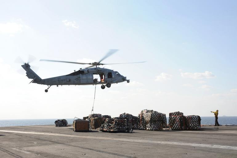 | Keywords: US Navy 111108-N-VA840-029 An MH-60S Sea Hawk helicopter assigned to Helicopter Sea Combat Squadron (HSC) 9 transports cargo to the aircraft carrie.jpg en ARABIAN GULF Nov 8 2011 An MH-60S Sea Hawk helicopter assigned to Helicopter Sea Combat Squadron HSC 9 transports cargo to the aircraft carrier USS George H W Bush CVN 77 during a vertical replenishment George H W Bush is deployed to the U S 5th Fleet area of responsibility on its first operational deployment conducting maritime security operations and support missions as part of Operations Enduring Freedom and New Dawn U S Navy photo by Mass Communication Specialist 3rd Class Leonard H Adams/Released 2011-11-08 111108-N-VA840-029 Navy http //www navy mil/view_image asp id 110048 U S Navy photo by Mass Communication Specialist 3rd Class Leonard H Adams PD-USGov-Military-Navy MH-60S Seahawk Helicopter Sea Combat Squadron 9 United States Navy USS George H W Bush CVN-77 flight deck |