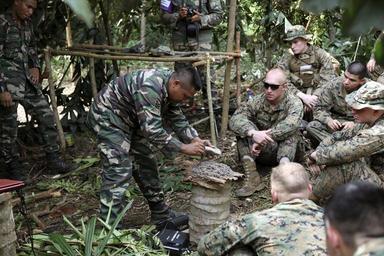 | Keywords: US Navy 111215-M-FW834-027 A Malaysian soldier from the Malaysian Army Jungle Survival Wing teaches the Marines of India Company, Battalion Landing.jpg en Kuantan Malaysia Dec 15 2011 A Malaysian soldier from the Malaysian Army Jungle Survival Wing teaches the Marines of India Company Battalion Landing Team 3/1 11th Marine Expeditionary Unit 11th MEU how to use materials found in the jungle to start a fire during Kilat Eagle a bilateral training exercise between Marines and Sailors of the 11th MEU and soldiers from the Malaysian army The Camp Pendleton Calif based unit is embarked aboard the amphibious assault ship USS Makin Island LHD 8 the amphibious transport dock ship USS New Orleans LPD 18 and the amphibious dock landing ship USS Pearl Harbor LSD 52 and arrived in Malaysia Dec 14 as part of a scheduled deployment U S Marine Corps photo by Staff Sgt Chance W Haworth/Released 2011-12-15 111215-M-FW834-027 Navy http //www navy mil/view_image asp id 112421 U S Marine Corps photo by Staff Sgt Chance W Haworth PD-USGov-Military-Navy Aboard USS Makin Island LHD-8 Military of Malaysia Malaysian Army |
