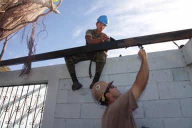 | Keywords: US Navy 120105-A-IP644-045 Builder 2nd Class Nicholas Fox paints rust guard on a rafter.jpg en SAN JOSE Guatemala Jan 5 2012 Builder 2nd Class Nicholas Fox right assigned to Navy Mobile Construction Battalion NMCB 23 embarked aboard High Speed Vessel HSV 2 Swift and Guatemalan Army Corps of Engineers soldier Alex Fernando Samayoa paint rust guard on a rafter for a roof being built at Escuela Rural Aldea Magueyes 1 with NMCB-23 will complete minor structural electrical and plumbing repairs to the school during a ten-day HSV-Southern Partnership Station 2012 project Southern Partnership Station is an annual deployment of U S ships to the U S Southern Command area of responsibility in the Caribbean Central and South America U S Army photo by Spc Jennifer Grier/Released 2012-01-05 120105-A-IP644-045 Navy http //www navy mil/view_image asp id 113142 U S Army photo by Spc Jennifer Grier PD-USGov-Military-Navy Images from US Navy location San José Guatemala |