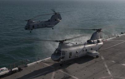 | Keywords: US Navy 120114-N-PB383-291 A helicopter takes off the flight deck.jpg en ARABIAN GULF Jan 14 2012 A CH-46E Sea Knight helicopter assigned to the Red Dragons of Marine Medium Helicopter Squadron 268 Reinforced takes off the flight deck of the amphibious transport dock ship USS New Orleans LPD 18 New Orleans and embarked Marines assigned to the 11th Marine Expeditionary Unit 11th MEU are deployed as part of the Makin Island Amphibious Ready Group supporting maritime security operations and theater security cooperation efforts in the U S 5th Fleet area of responsibility U S Navy photo by Mass Communication Specialist 2nd Class Dominique Pineiro/Released 2012-01-14 120114-N-PB383-291 Navy http //www navy mil/view_image asp id 113559 U S Navy photo by Mass Communication Specialist 2nd Class Dominique Pineiro PD-USGov-Military-Navy Flight deck of USS New Orleans LPD-18 CH-46 Sea Knight |