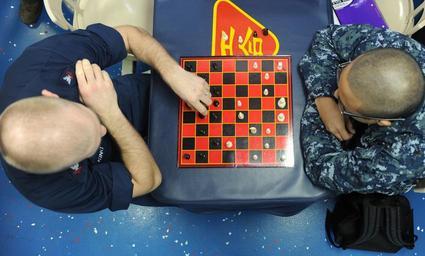 | Keywords: US Navy 120126-N-ZZ999-015 Air-Traffic Controller 2nd Class Isaiah King makes a move in a chess match with Engineman Fireman Recruit Jeffrey Delape.jpg en ARABIAN SEA Jan 26 2012 Air-Traffic Controller 2nd Class Isaiah King makes a move in a chess match with Engineman Fireman Recruit Jeffrey Delapena on the mess decks aboard the amphibious assault ship USS Makin Island LHD 8 Makin Island and embarked Marines assigned to the 11th Marine Expeditionary Unit 11th MEU are deployed supporting maritime security operations and theater security cooperation efforts in the U S 5th Fleet area of responsibility U S Navy photo by Mass Communication Specialist Seaman Apprentice Ethan Tracey/Released 2012-01-26 120126-N-ZZ999-015 Navy http //www navy mil/view_image asp id 114557 U S Navy photo by Mass Communication Specialist Seaman Apprentice Ethan Tracey PD-USGov-Military-Navy Aboard USS Makin Island LHD-8 People playing chess |