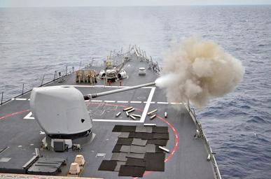 | Keywords: US Navy 120127-N-ZZ999-123 The guided-missile destroyer USS John S. McCain (DDG 56) fires exercise rounds from its MK-45 five-inch gun system durin.jpg en PHILIPPINE SEA Jan 28 2012 The guided-missile destroyer USS John S McCain DDG 56 fires exercise rounds from its MK-45 five-inch gun system during a high-speed maneuvering surface target exercise supporting MULTISAIL 2012 McCain is forward deployed to Yokosuka Japan U S Navy photo by Ens Jimmy Stokes/Released 2012-01-28 120127-N-ZZ999-123 Navy http //www navy mil/view_image asp id 114338 U S Navy photo by Ens Jimmy Stokes PD-USGov-Military-Navy USS John S McCain DDG-56 5 /54 caliber Mark 45 gun firing |