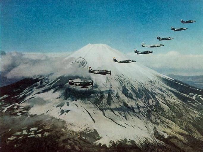 | Keywords: US Navy Air Task Group 1 (ATG-1) aircraft in flight c1955.jpg  U S Navy aircraft of Air Task Group 1 ATG-1 flying past Mount Fuji Japan ATG-1 was assigned to the aircraft carrier USS Wasp CVA-18 for a deployment to the Western Pacifc from 1 September 1954 to 11 April 1955 The following aircraft and squadrons are identifiable right to left Grumman F9F-2 Panther from either Fighter Squadron 52 VF-52 Sandlancers or VF-151 Black Knights ; Grumman F9F-6 Cougar from VF-111 Sundowners ; Grumman F9F-2 Panther from either Fighter Squadron 52 VF-52 Sandlancers or VF-151 Black Knights ; McDonnell F2H-3 Banshee from Composite Squadron 3 VC-3 Det H Blue Nemesis ; Grumman F9F-2 Panther from VF-151 Black Knights ; McDonnell F2H-2P Banshee from VC-61 Det H Eyes of the Fleet ; Douglas AD-6 Skyraider from VF-194 Main Battery ; Douglas AD-4N Skyraider from VC-35 Det H Night Hecklers U S Navy photo http //navysite de/cruisebooks/cv18-55/094 htm from the http //navysite de/cruisebooks/cv18-55/index_006 htm USS Wasp CVA-18 1954-1955 cruise book available at http //navysite de/cruisebooks/index html Navysite de ca 1955 USN PD-USGov-Military-Navy United States Navy carrier air wings Aerial photographs of Mount Fuji |
