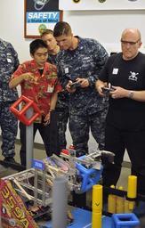 | Keywords: US Pacific Fleet and Office of Naval Research sponsor robotics competition, RIMPAC 2014 140705-N-UG232-008.jpg en Yoshio Yoshizumi a senior at Waialua High School instructs Electronics Technician 3rd Class Joel Reed from USS Cape St George CG 71 in piloting the Waialua team's robot during a high school robotics competition held at Pearl Harbor Naval Shipyard The robot was one of several entries in the Rim of the Pacific RIMPAC Exercise 2014 Robotics Competition sponsored by the U S Pacific Fleet and the Office of Naval Research While showing off their entries students had a chance to meet RIMPAC participants and build proficiency in Science Technology Engineering and Math STEM skills Twenty-two nations 49 ships 6 submarines more than 200 aircraft and 25 000 personnel are participating in RIMPAC exercise from June 26 to Aug 1 in and around the Hawaiian Islands The world's largest international maritime exercise RIMPAC provides a unique training opportunity that helps participants foster and sustain the cooperative relationships that are critical to ensuring the safety of sea lanes and security on the world's oceans RIMPAC 2014 is the 24th exercise in the series that began in 1971 U S Navy photo by Mass Communication Specialist 1st Class Martin Wright/Released 2014-07-05 Petty Officer 1st Class Martin Wright https //www dvidshub net/image/1439591 140705-N-UG232-008 2014-07-09 05 17 JOINT BASE PEARL HARBOR-HICKAM HI US PD-USGov-Military-Navy People at Joint Base Pearl Harbor-Hickam USS Cape St George CG-71 RIMPAC 2014 Office of Naval Research Images from DoD uploaded by Fæ |