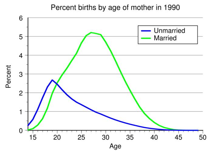| Keywords: US percent of births by age of mother and marital status in 1990.svg translate yes en Percent of births by age of mother and marital status in the United States in 1990 The median age of unmarried mothers was 21 and 27 for married mothers 72 0 of births were to married mothers and 28 0 to unmarried mothers Data from https //nchs beyond2020 com/Vitalstats/ReportFolders/reportFolders aspx CDC 2016-05-15 own Delphi234 other versions Generated with Wikimedia SVG Chart SVG Chart/box cc-zero Childbirth graphs Demographics of the United States |