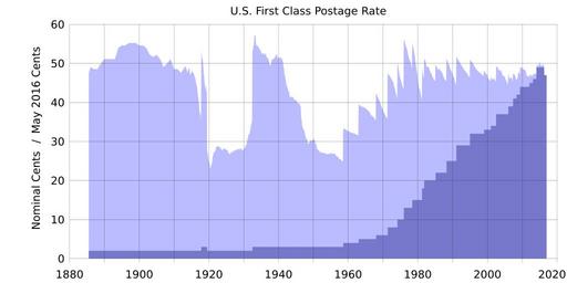 | Keywords: US Postage History.svg History of US postage 1885 - 2016 May 2016 inflation adjustment CPI Bureau of Labor Statistics ftp //ftp bls gov/pub/special requests/cpi/cpiai txt; pre-1913 http //oregonstate edu/Dept/pol_sci/fac/sahr/infcf16652005 pdf Rates en History of United States Postal Service rates See also Image US_first-class_postage_stamp_rates svg <math>Inflation\ Adjustment Postage \times \frac May\ 2016\ CPI CPI </math> en wikipedia 2007-06-23 Lalala666 wikipedia en Lalala666 original upload log page en wikipedia US_Postage_History svg 2007-06-23 18 57 Lalala666 800×400×0 76511 bytes History of US postage 1885 - 2007 Apr 07 inflation adjustment Political history of the United States Postal history of the United States United States Postal Service |