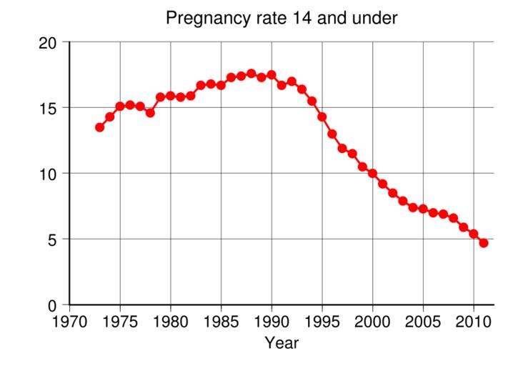 | Keywords: US Pregnancy Rate 14 and Under.svg translate yes en Pregnancy rate per 1000 14 and under in the United States Data from http //www guttmacher org/pubs/USTPtrends10 pdf Table 2 4 pg 13 2015-01-23 own Delphi234 other versions Generated with Wikimedia SVG Chart SVG Chart/box cc-zero Human pregnancy |