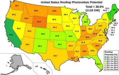 | Keywords: US rooftop photovoltaics potential.svg en US rooftop photovoltaics potential Most states could obtain from 30 to 50 of all electricity used from rooftop photovoltaics The lowest is Wyoming at 14 3 and the highest is California at 74 2 It is estimated that rooftop solar panels could generate 1432 TWh/year in the United States 38 6 of the total Alaska and Hawaii are not included Efficiency was assumed to be 16 and if 20 panels are used the potential is increased by 25 http //www nrel gov/news/press/2016/24662 Data 2016-03-31 own Delphi234 other versions cc-zero United States solar power resources |