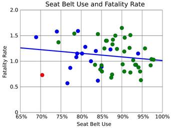| Keywords: US seat belt use and fatality rate.svg translate yes en There is a small but significant correlation between seat belt use and fatality rate despite survivability in an automobile accident being reduced by three to four times by not wearing a seat belt The data shows that avoiding an accident is the best way to prevent highway fatalities Massachusetts has the lowest fatality rate but has the fifth lowest rate of seat belt use Average seat belt use is 87 and instead of 13 of fatalities being unsecured was 49 of fatalities The SVG shows the state name if the mouse is held over the data point Fatality rate is per 100 million vehicle miles Red states New Hampshire have no seat belt law for adults blue have a secondary enforcement law and green a primary enforcement law Data is for 2014 from US NHTSAhttp //www-nrd nhtsa dot gov/departments/nrd-30/ncsa/STSI/USA 20WEB 20REPORT HTMhttp //www-nrd nhtsa dot gov/Pubs/812149 pdf 2016-06-09 own Delphi234 other versions cc-zero Seat belts Road transport safety in the United States |