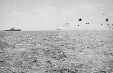 | Keywords: US ships under attack off Kwajalein 1943.JPG A Japanese plane is shot down over a U S Navy New Orleans-class heavy cruiser during the attacks on Kwajalein and Wotje atolls 4 December 1943 The cruiser is probably USS San Francisco CA-38 the carrier the USS Yorktown CV-10 Both ships came under attack around 12 50 hrs San Francisco shooting down two planes Yorktown one 520587 1943-12-04 Cmdr Edward Steichen U S Navy photo 80-G-476250 File A burning Japanese torpedo-bomber falls after being knocked down by artillery from American warships - NARA - 520983 tif PD-USGov-Military-Navy USS Yorktown CV-10 USS San Francisco CA-38 Edward Steichen |