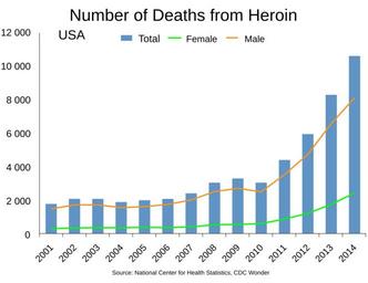 | Keywords: US timeline. Heroin deaths.svg en English National Overdose Deaths ”Number of Deaths from Heroin The figure above is a bar chart showing the total number of U S overdose deaths involving heroin from 2001 to 2014 The chart is overlayed by a line graph showing the number of deaths by females and males From 2001 to 2014 there was a 6-fold increase in the total number of deaths 2016-12-26 - date of creation of the SVG version of the chart My own work based on this https //d14rmgtrwzf5a cloudfront net/sites/default/files/cdc-us-overdose-deaths-2014_jr-5 jpg Chart from http //www drugabuse gov/related-topics/trends-statistics/overdose-death-rates Overdose Death Rates By National Institute on Drug Abuse NIDA SVG derived by me from File US timeline Heroin deaths jpg which was derived from National Institute on Drug Abuse And User Timeshifter User Timeshifter cropped the original chart and added USA to it User Timeshifter put the adapted chart under the same public domain license See Commons Convert tables and charts to wiki code or image files and the section about adding text to chart images other versions PD-USGov Drug-related death statistics |