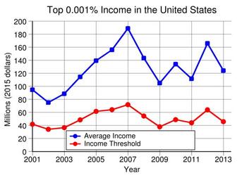 | Keywords: US Top 0.001 Percent Income.svg translate yes en US Top 0 001 average income and income threshold from 2001 to 2013 in constant 2015 dollars Data is from https //www irs gov/pub/irs-soi/13in01etr xls US IRS 2015-06-06 own Delphi234 other versions Generated with Wikimedia SVG Chart SVG Chart/box current annually Data wikitable sortable colspan 12 Average Adjusted Gross Income by Percentile Excluding Returns Filed by Dependents Tax Years 2001 “2013 constant 2015 dollars - Year CPI Top 0 001<br>percent Top 0 01<br>percent Top 0 1<br>percent Top 1<br>percent Top 2<br>percent Top 5<br>percent Top 10<br>percent Top 25<br>percent Top 50<br>percent US Average - 2001 177 1 94 943 591 24 293 640 5 520 937 1 193 941 762 869 433 562 291 459 176 387 117 390 68 572 - 2002 179 9 75 341 043 19 723 371 4 627 808 1 055 695 685 570 398 400 271 778 167 598 112 453 65 762 - 2003 184 0 88 759 813 21 974 898 4 966 490 1 098 891 707 796 407 018 275 932 169 036 112 792 65 677 - 2004 188 9 114 647 797 28 723 006 6 303 762 1 309 801 824 876 459 467 303 994 181 204 119 342 68 974 - 2005 195 3 139 530 479 35 295 581 7 629 376 1 519 191 940 360 510 676 331 024 192 359 124 850 71 700 - 2006 201 6 156 177 676 38 314 211 8 192 750 1 612 031 991 405 534 273 344 145 198 155 127 785 72 951 - 2007 207 342 189 079 282 43 404 818 8 876 616 1 698 479 1 039 205 555 536 355 741 203 313 130 484 74 298 - 2008 215 303 143 514 316 32 966 532 6 841 589 1 372 441 858 286 475 116 312 540 184 053 119 752 67 978 - 2009 214 537 105 181 082 23 465 784 5 010 797 1 086 813 701 482 406 384 276 355 168 534 111 265 63 133 - 2010 218 056 134 240 519 29 507 323 5 980 726 1 221 230 773 582 437 282 292 307 174 866 114 234 64 716 - 2011 224 939 111 836 641 26 408 938 5 687 533 1 200 150 765 652 434 927 291 222 174 058 113 506 64 163 - 2012 229 594 166 164 329 38 035 267 7 715 604 1 499 590 927 967 505 383 328 323 190 009 121 953 68 592 - 2013 232 957 124 321 917 28 312 396 5 999 996 1 265 076 807 584 457 452 304 795 181 006 117 631 66 453 - class sortbottom 2014 236 736 10 - class sortbottom 2015 237 017 10 wikitable sortable colspan 17 Adjusted gross income threshold on percentiles constant 2015 dollars - Year CPI Top 0 001 percent Top 0 01 percent Top 0 1 percent Top 1 percent Top 2 percent Top 3 percent Top 4 percent Top 5 percent Top 10 percent Top 20 percent Top 25 percent Top 30 percent Top 40 percent Top 50 percent Minimum Wage - 2001 177 1 41 931 446 9 194 215 1 865 245 410 377 277 825 224 555 194 949 176 768 128 681 90 762 78 996 69 409 53 925 42 047 14 391 - 2002 179 9 34 151 372 7 761 634 1 640 743 390 234 264 360 216 608 190 477 172 262 126 083 89 495 77 819 68 142 52 796 41 236 14 167 - 2003 184 0 36 697 909 8 226 228 1 696 588 394 091 264 796 216 726 189 526 172 277 125 555 89 273 77 154 67 438 52 019 40 508 13 852 - 2004 188 9 48 658 749 10 608 809 2 030 037 426 597 281 459 227 264 196 571 176 612 127 778 90 427 78 789 68 715 52 800 40 932 13 544 - 2005 195 3 61 646 866 13 032 740 2 352 178 460 273 297 809 236 320 203 013 181 089 129 691 90 765 78 667 68 669 52 623 40 636 13 000 - 2006 201 6 64 268 947 13 696 032 2 497 878 473 332 304 266 241 996 207 455 185 040 131 695 91 440 79 113 68 783 52 609 40 463 12 594 - 2007 207 342 71 966 184 14 571 803 2 573 185 487 471 309 146 245 579 210 875 188 481 133 055 92 276 79 514 69 293 52 812 40 628 13 131 - 2008 215 303 54 543 734 11 116 225 2 056 011 432 099 286 641 230 904 199 941 180 003 128 594 89 044 76 854 66 640 50 771 38 904 14 260 - 2009 214 537 37 984 117 7 961 669 1 623 362 388 849 268 569 219 555 192 710 173 829 126 145 87 540 75 364 65 045 49 195 37 735 15 938 - 2010 218 056 48 955 755 9 524 569 1 776 504 401 837 274 766 223 850 194 590 175 629 126 764 87 459 75 137 64 687 48 799 37 324 16 454 - 2011 224 939 44 218 564 9 304 152 1 809 905 409 787 277 051 224 902 195 789 176 734 126 587 86 657 74 277 64 053 48 177 36 693 15 890 - 2012 229 594 64 074 913 12 495 349 2 231 048 448 736 295 152 235 292 202 766 181 501 129 243 88 202 75 726 65 266 49 010 37 221 15 627 - 2013 232 957 45 883 069 9 625 419 1 893 279 436 185 292 020 235 542 203 966 182 893 129 920 88 958 76 261 65 777 49 308 37 483 15 461 - class sortbottom 2014 236 736 15 - class sortbottom 2015 237 017 15 cc-zero Income distribution in the United States |