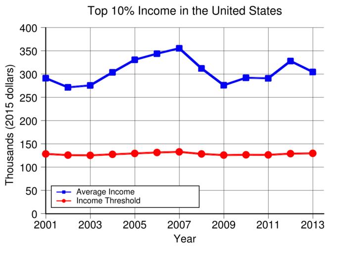 Keywords: US Top 10 Percent Income.svg translate yes en US Top 10 average income and income threshold from 2001 to 2013 in constant 2015 dollars Data is from https //www irs gov/pub/irs-soi/13in01etr xls US IRS 2015-06-06 own Delphi234 other versions For data see File US Top 0 001 Percent Income svg Generated with Wikimedia SVG Chart SVG Chart/box current annually cc-zero Income distribution in the United States