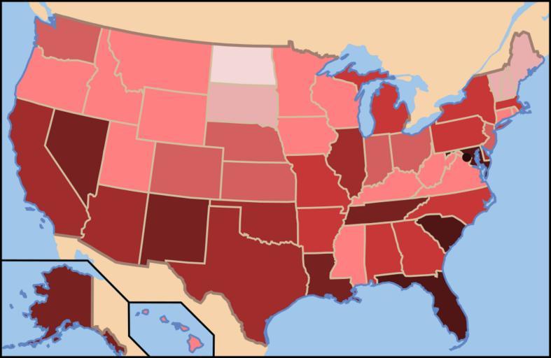 | Keywords: US Violent Crime 2004.svg Map of violent crime per 100 000 people in the USA by state in 2004 Violent crime includes Homicide rape robbery and serious assault f4d7d7 ‰¤ 100 e9afaf >100-200 de8787 >200-300 d35f5f >300-400 c83737 >400-500 a02c2c >500-600 782121 >600-700 501616 >700-800 280b0b >800 Made with the data from the table in w en Crime in the United States 2009-07-15 TastyCakes File Map of US Violent Crime svg Maps of crime statistics for the United States | ||||