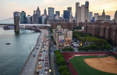 Keywords: usa america nyc new york new york city city evening twilight dusk sunset skyline skyscrapers skyscraper bridge brooklyn bridge road baseball