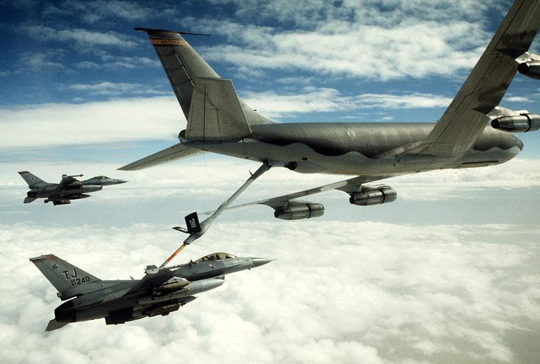 Keywords: USAF F-16C is refueled from a KC-135 in the Gulf War.jpg en A U S Air Force F-16C Fighting Falcon fighter aircraft from the 401st Tactical Fighter Wing refuels from a U S Air Force KC-135 Stratotanker as another F-16 waits in formation during Operation Desert Storm 1991-02-01 http //www flickr com/photos/usairforce/5375907868/in/photostream/ Staff Sgt Lee F Corkran PD-USGov Uploaded with UploadWizard Aerial refueling of F-16C/D Fighting Falcon 16th Air Expeditionary Task Force Boeing KC-135 Stratotanker Gulf War 1990-1991 forces |