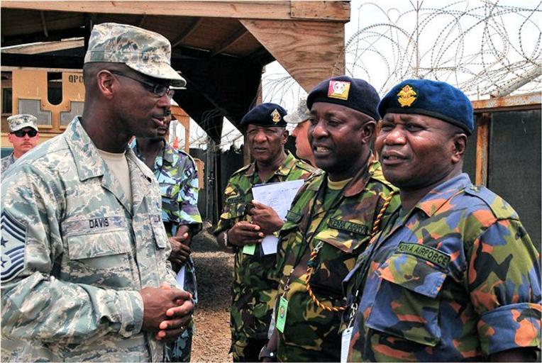 | Keywords: USAFE - Senior Enlisted Leadership in Action.jpg en CAMP LEMONNIER Djibouti March 27 2012 - Combined Joint Task Force - Horn of Africa Command Senior Enlisted Leader U S Air Force Chief Master Sgt James E Davis Kenya Air Force Base Sgt Major Maurice Atsango Matwang'a right and Kenya Army Weapons Training Sgt Major David Karisa Barisa discuss a personnel inspection they just completed here March 27 during a visit with Task Force Raptor soldiers from U S Army 3rd Squadron 124th Cavalry Regiment Texas Army National Guard CJTF-HOA hosted the four Kenyan Ministry of Defense senior enlisted leaders to exchange best practices and enhance understanding of the enlisted leadership roles and responsibilities that affect mission execution U S Navy photo by Mass Communication Senior Chief Petty Officer Maria R Escamilla http //www africom mil/Newsroom/Article/8887/kenyan-us-senior-enlisted-leadership-in-action United States Navy 2012-03-27 USGOV-PD PD-USGov-Military-Navy 2012 photographs 27 March Airman Battle Uniform March 2012 in Africa Military units and formations of the United States Air Force People of the United States in 2012 Texas National Guard Texas Army National Guard Air force of Kenya 124th Cavalry Regiment United States |