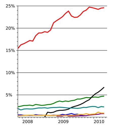 | Keywords: Usage share of alternative web browsers.svg Usage share of alternative web browsers Source StatCounter svg Newer data middle of 2008 October 2011 Legend red Firefox black Chrome green Safari teal Opera blue Netscape purple Opera Mini Orange Other validSVG Usage share of alternative web browsers all browsers except MS IE Schema che mostra l'uso dei browser alternativi tutti i browser tranne MS IE Marktanteile alternativer Webbrowser alle Browser außer MS IE Alternatif web tarayıcılarının kullanım oranları MS IE hariç أغلب المستخدمين يفضلون برنامج موزيلا فاير فوكس الأكثر شعبية Procentowy udział alternatywnych przeglądarek na świecie Reparto del uso de navegadores web alternativos todos los navegadores excepto MS IE Использование альте нативных б аузе ов всех к оме IE 使用 主流網頁 覽器的佔 率(除了 MS IE 以外的 覽器) 使用 主流网页浏览器的占 率(除了 MS IE 以外的 浏览器) self-made http //marketshare hitslink com/browser-market-share aspx qprid 1 qptimeframe M qpsp 99 qpnp 18 November 2007 - April 2009 http //marketshare hitslink com/browser-market-share aspx qprid 1 qptimeframe M qpsp 124 qpnp 18 May 2009 - Present 2010-09-01 ARC Gritt thumb left 350px Historical browser market share October 2005 to May 2009 Line charts of web browser statistics |