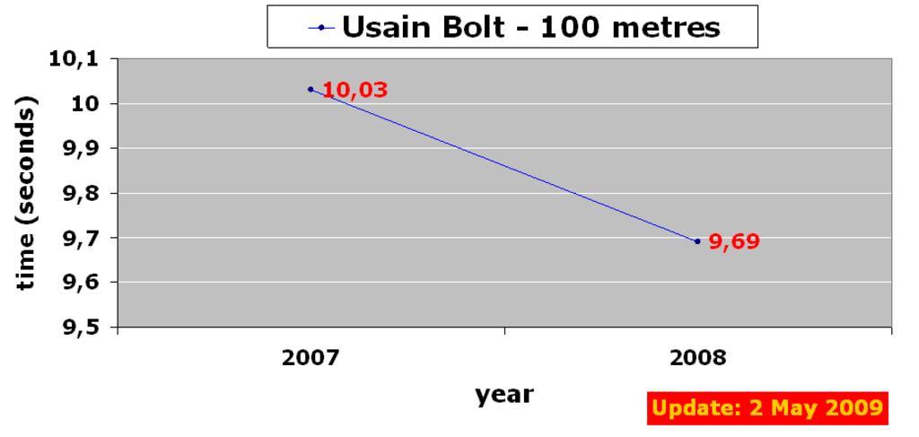 Keywords: Usain Bolt - progress - 100 m.PNG en The performance curve Usain Bolt ran the 100 meters Update 2 May 2009 sk Výkonnostná krivka Usaina Bolta v behu na 100 metrov aktualizovaná k 2 máju 2009 Own Marián 2 2009-05-02 none graph Usain Bolt